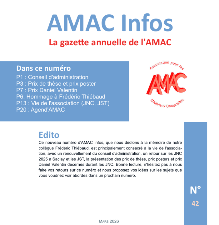 L'Amac'Info est un bulletin qui informe à la fois sur la vie de l'association mais aussi sur l'activité composite en général. Les deux derniers numéros sont réservés aux adhérents. Chaque numéro se compose des rubriques suivantes : Éditorial Vie de l'association Vie des laboratoires Agendamac
